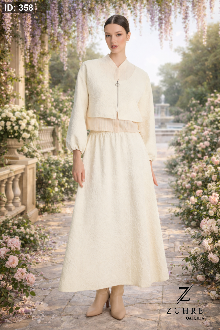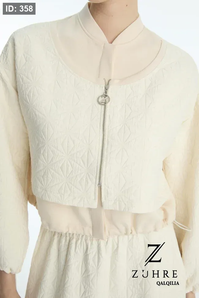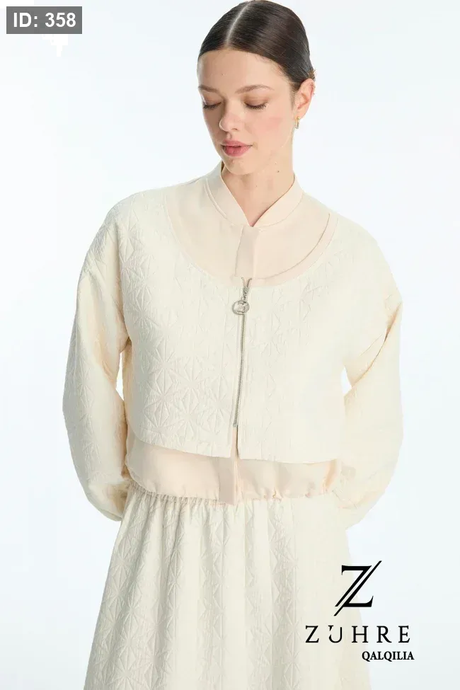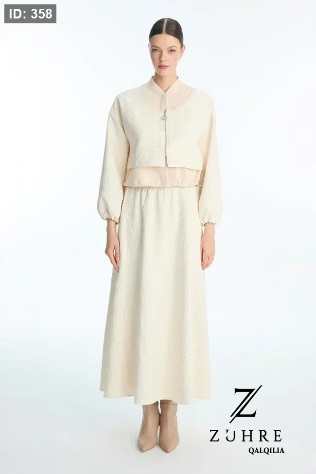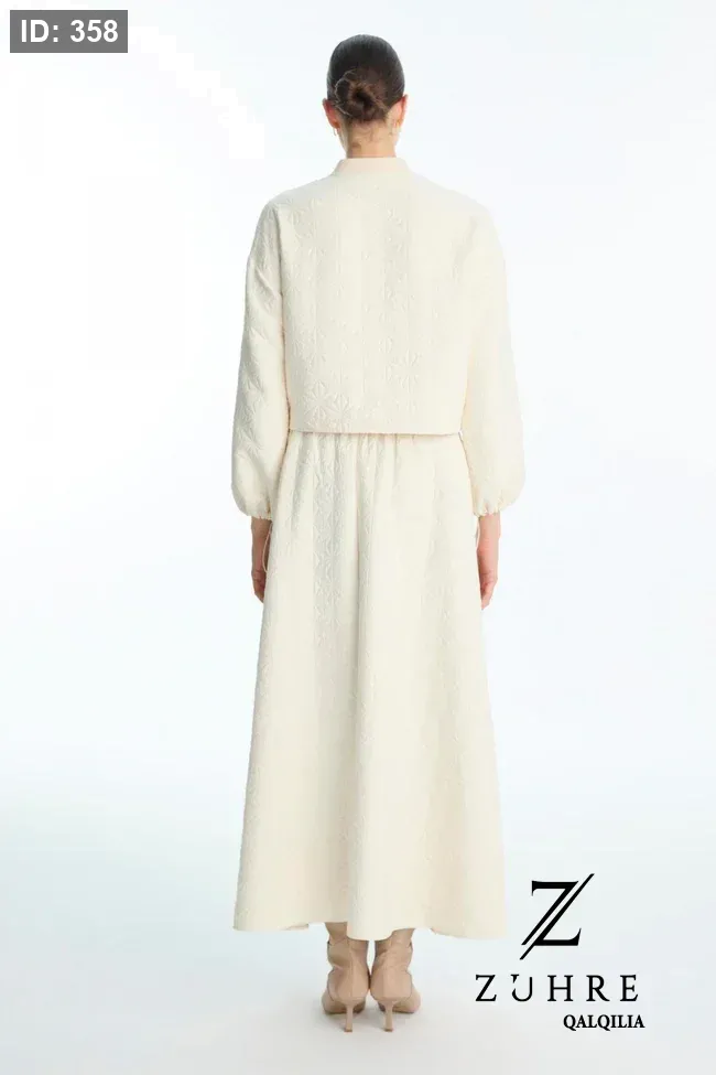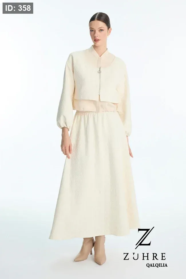 طقم كريمي قطعتين (جاكيت وتنورة) بنقشة جاكار وخصر مطاطي